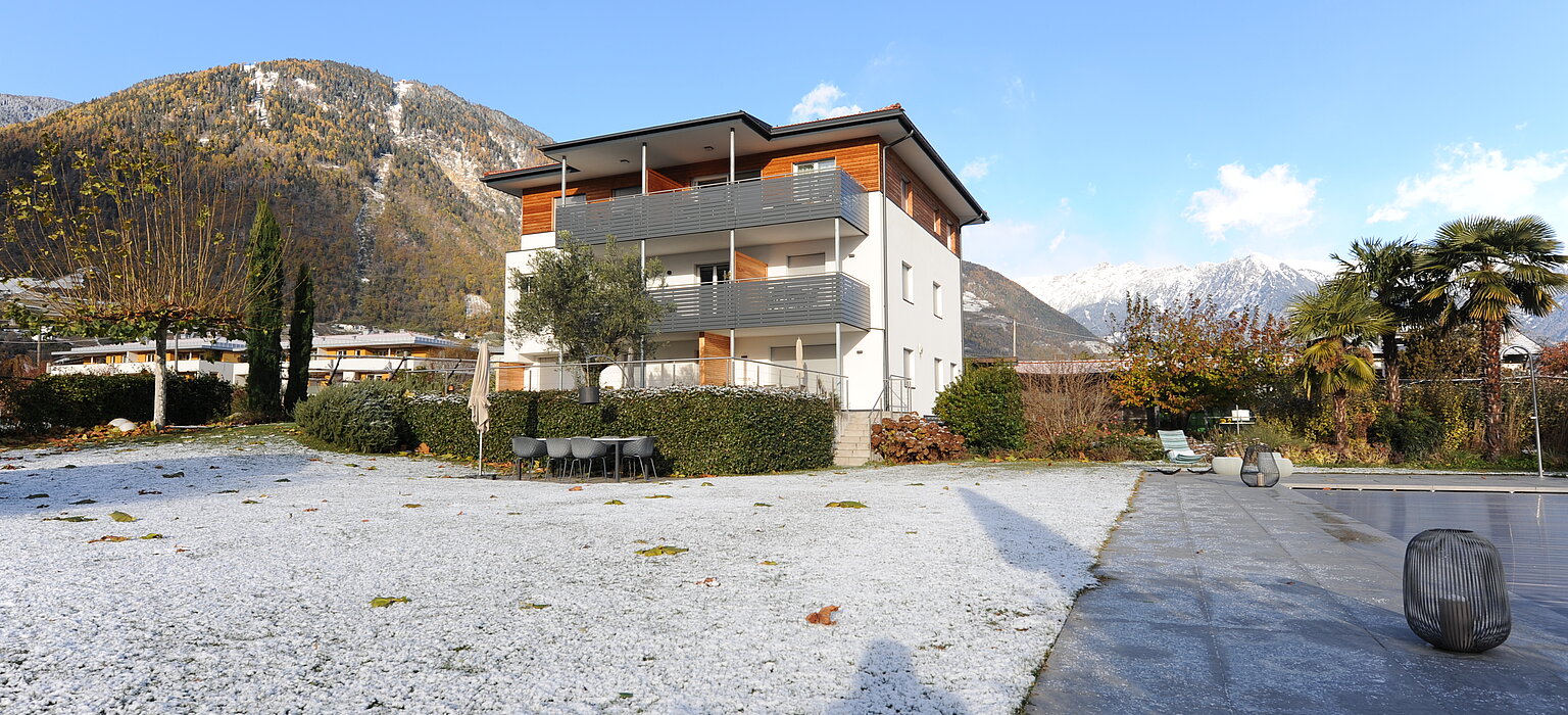 Moderne Ferienwohnungen in Lana mit warmen Farben, hochwertigen Materialien, klaren Linien – ein Garten mit beheiztem Schwimmbad – ruhige Lage zwischen Apfelwiesen, aber dennoch unweit des Ortszentrums: Das sind unsere überzeugenden Argumente für Ihren unvergesslichen Urlaub in Südtirol.